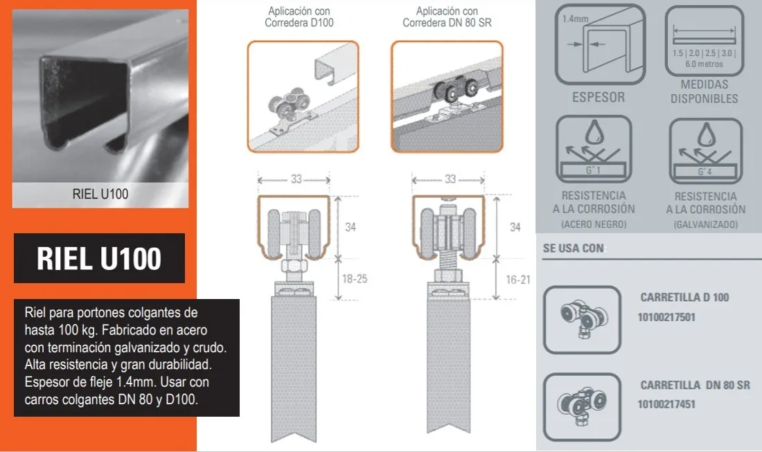 Riel U-100 para portones colgantes de hasta 100 kg, con alta resistencia y durabilidad de hasta 20'000 ciclos, fabricado en acero con terminación galvanizado y crudo pintado negro.