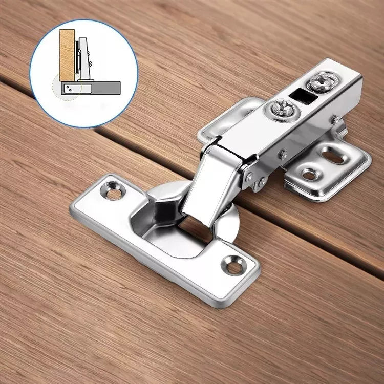Bisagra Bidimensional Push Open para puertas de muebles fabricadas en madera. Su montaje es slide-on, poseen terminación niquelada y sistema doble acción evitando que se suelten los tornillos. Posee resorte con acción inversa (no requiere tiradores), expulsando la puerta hacia afuera al presionar la zona donde está ubicado el forzador y la contra.