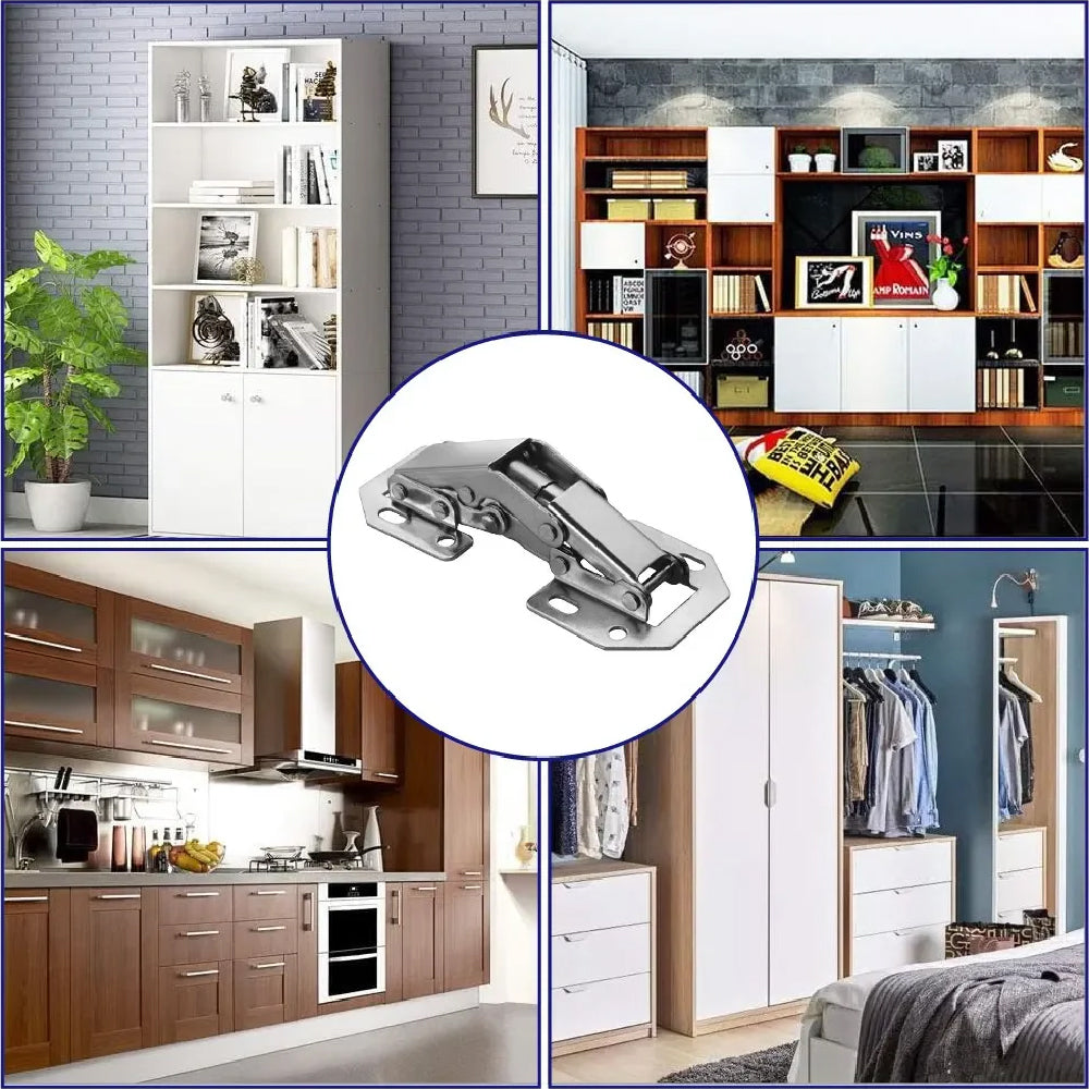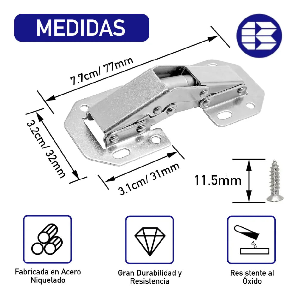 Ángulo de apertura de 90 grados que facilita la apertura de tus puertas y optimiza el uso de los gabinetes en cocinas, armarios y otros muebles. Fácil instalación, sólo es necesario un desarmador para completar la instalación del producto.