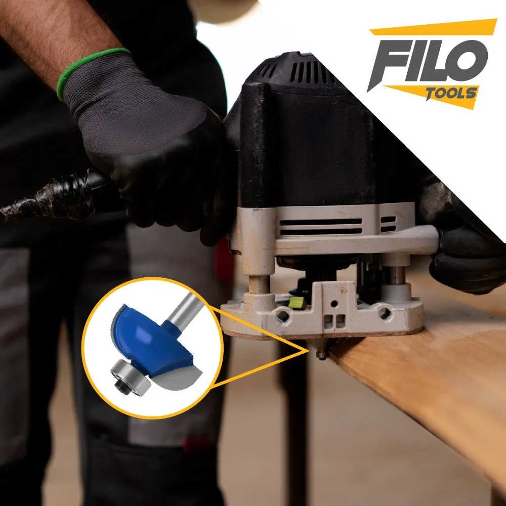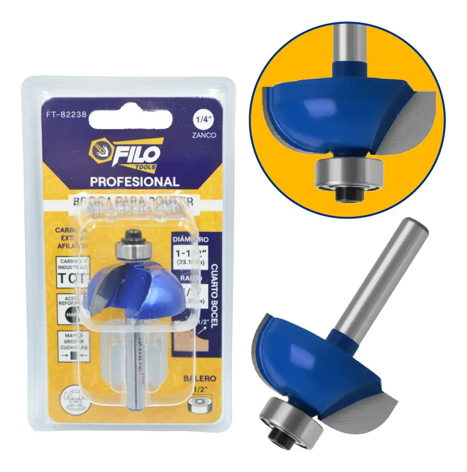 La Broca para Router Cuarto Bocel 1 1/2" para madera Filo Tools con zanco de 1/4 pulgada, balero de 1/2'' y radio de 1/2'' es ideal para realizar trabajos de carpintería con precisión y eficacia. Su diseño permite realizar redondeos limpios y detallados en diferentes tipos de madera.