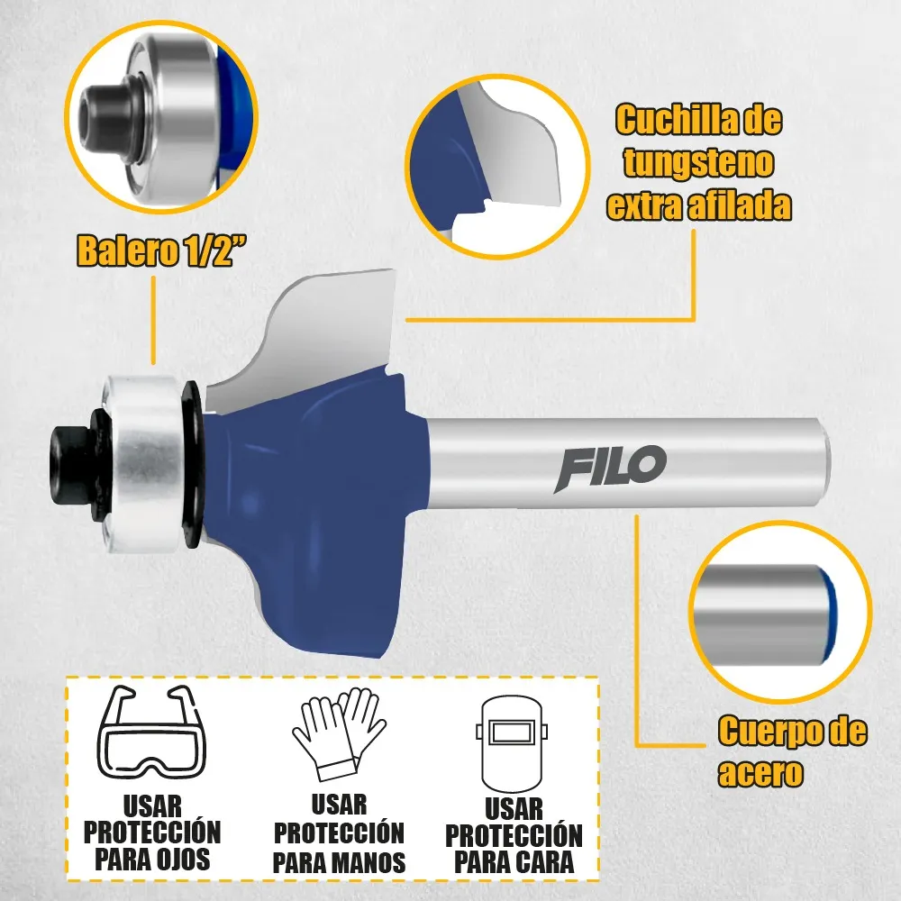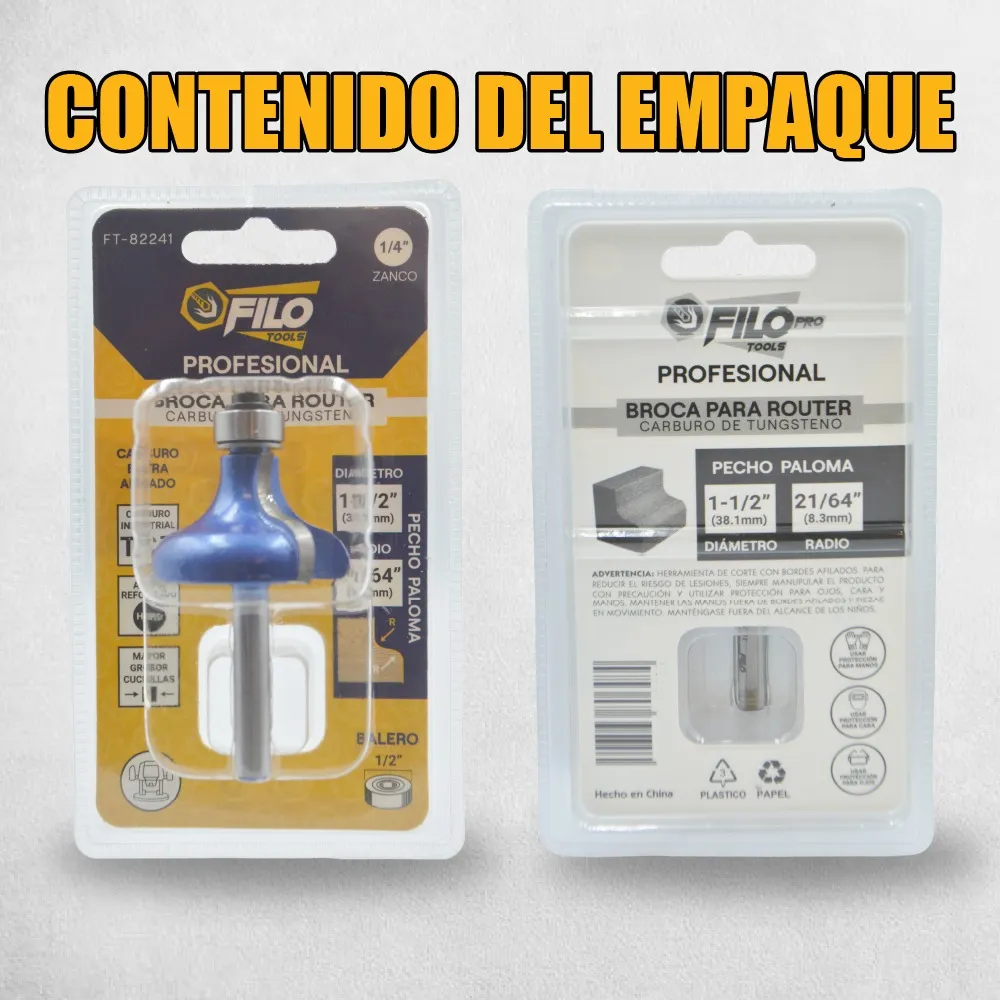 La Broca para Router Pecho Paloma 1-1/2" con Balero para madera Filo Tools, zanco de 1/4 pulgada, balero de 1/2'', diámetro de 1 1/2'' y y radio de 21/64" es ideal para realizar trabajos de carpintería con precisión y eficacia. Su diseño permite realizar redondeos limpios y detallados en diferentes tipos de madera.