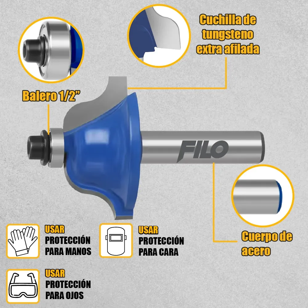 La Broca para Router Romana para madera Filo Tools, zanco de 1/4 de pulgada, balero de 1/2'', diámetro de 1 1/8'' y y radio de 1/4" es ideal para realizar trabajos de carpintería con precisión y eficacia. Su diseño permite realizar redondeos limpios y detallados en diferentes tipos de madera.