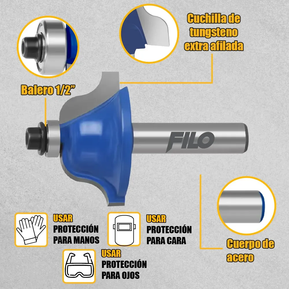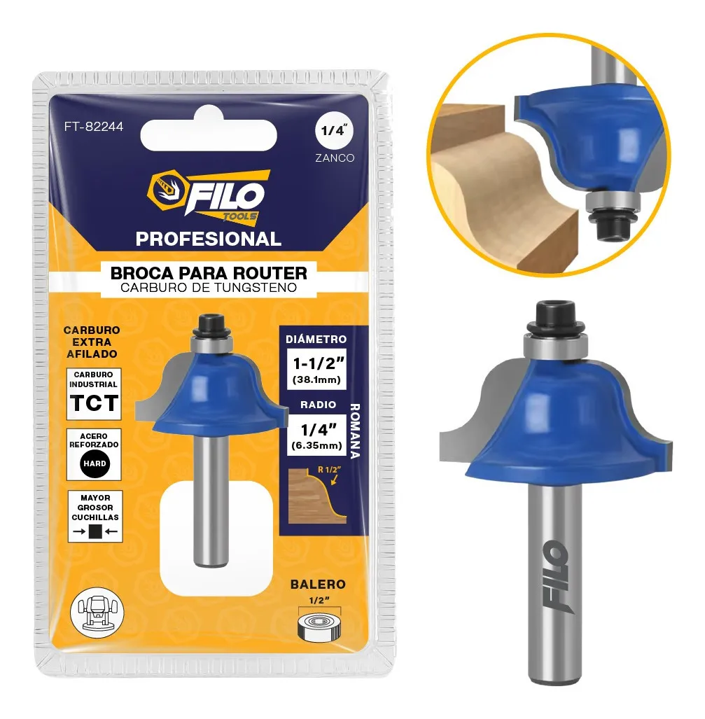 La Broca para Router Romana para madera Filo Tools, zanco de 1/4 de pulgada, balero de 1/2'', diámetro de 1 1/2'' y y radio de 1/4" es ideal para realizar trabajos de carpintería con precisión y eficacia. Su diseño permite realizar redondeos limpios y detallados en diferentes tipos de madera.