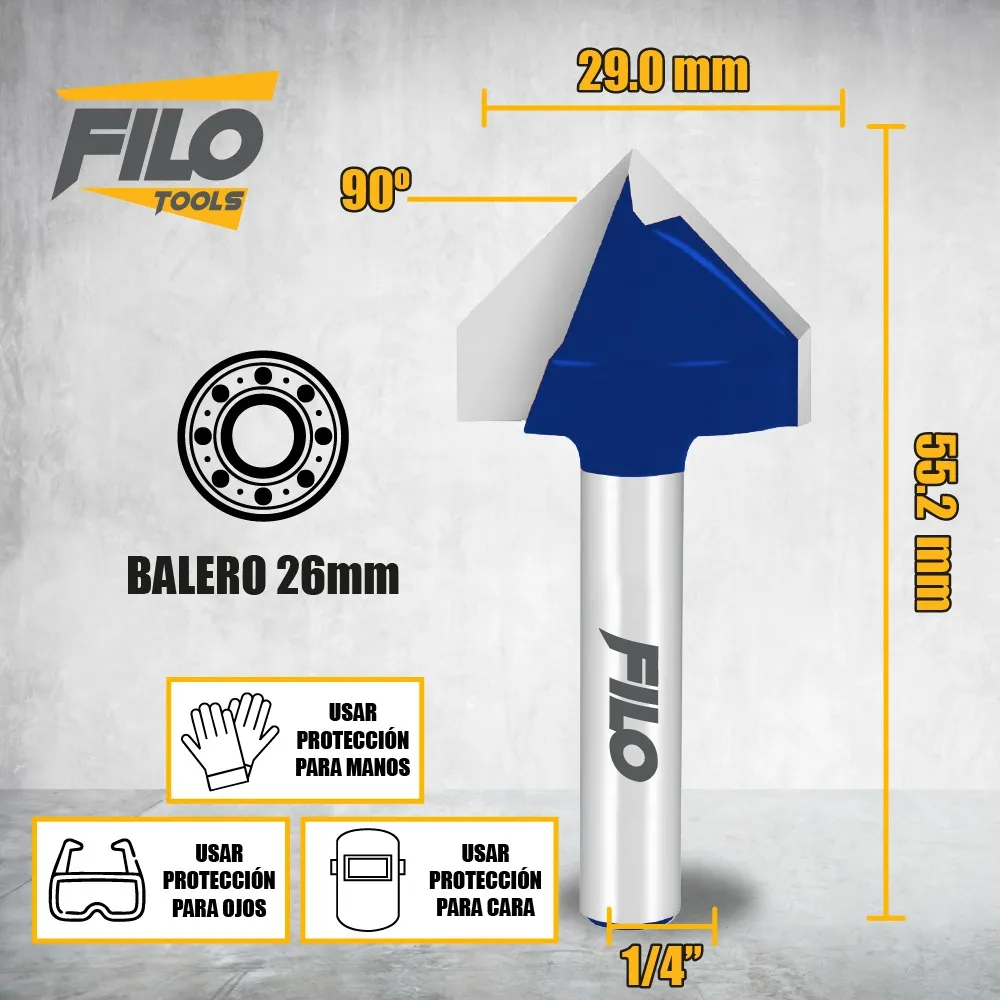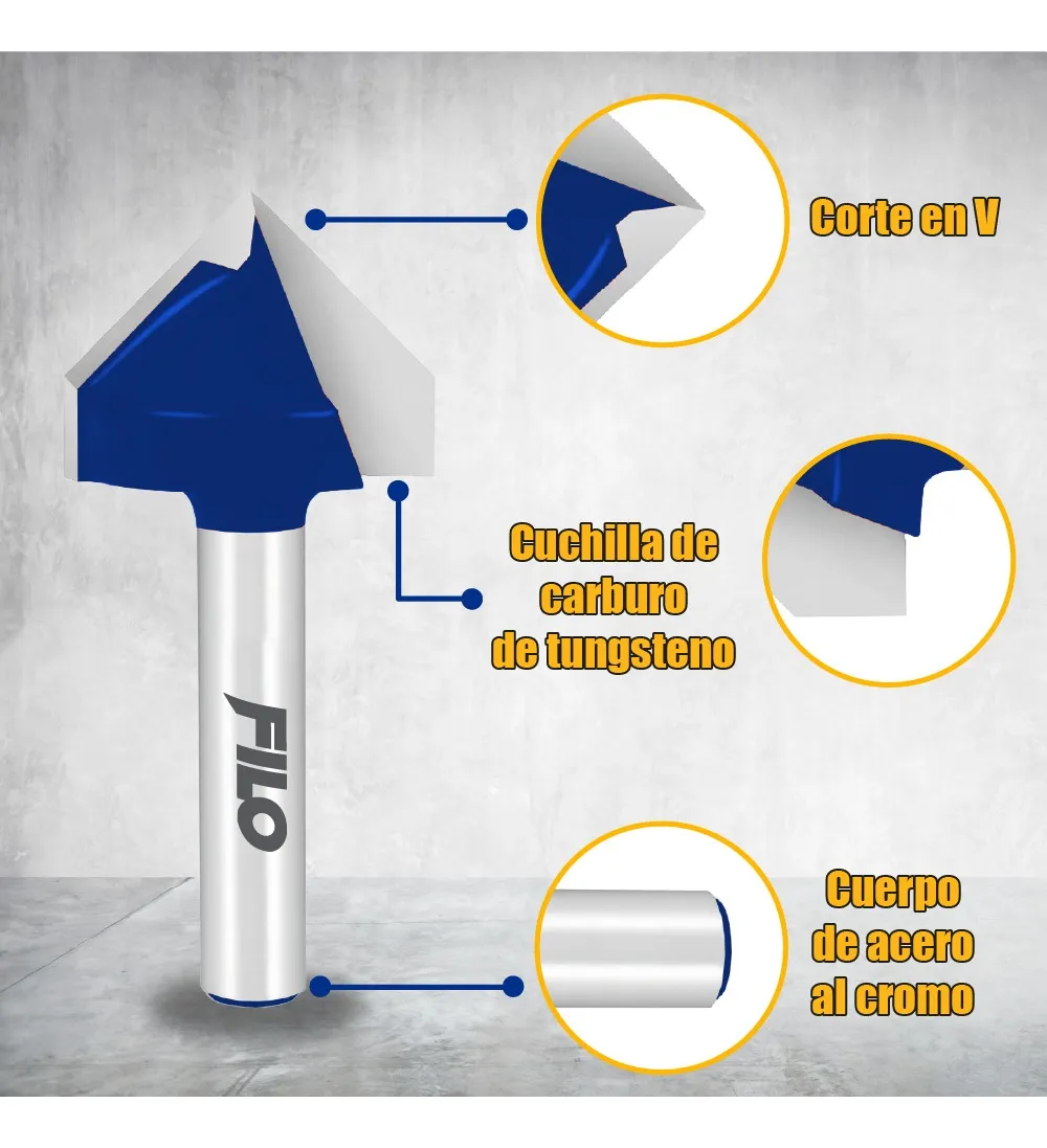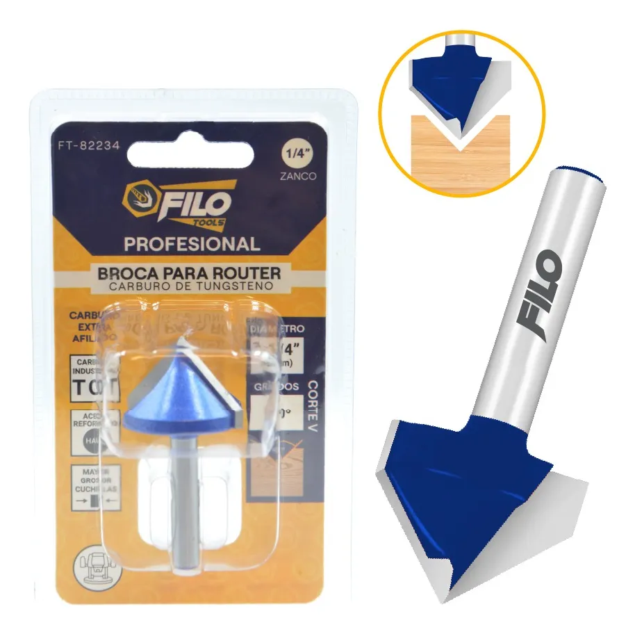 La Broca para Router Corte V 90° para madera Filo Tools con zanco de 1/4 pulgada, diámetro de 1 1/4'' es ideal para realizar trabajos de carpintería con precisión y eficacia. Su diseño permite realizar redondeos limpios y detallados en diferentes tipos de madera.