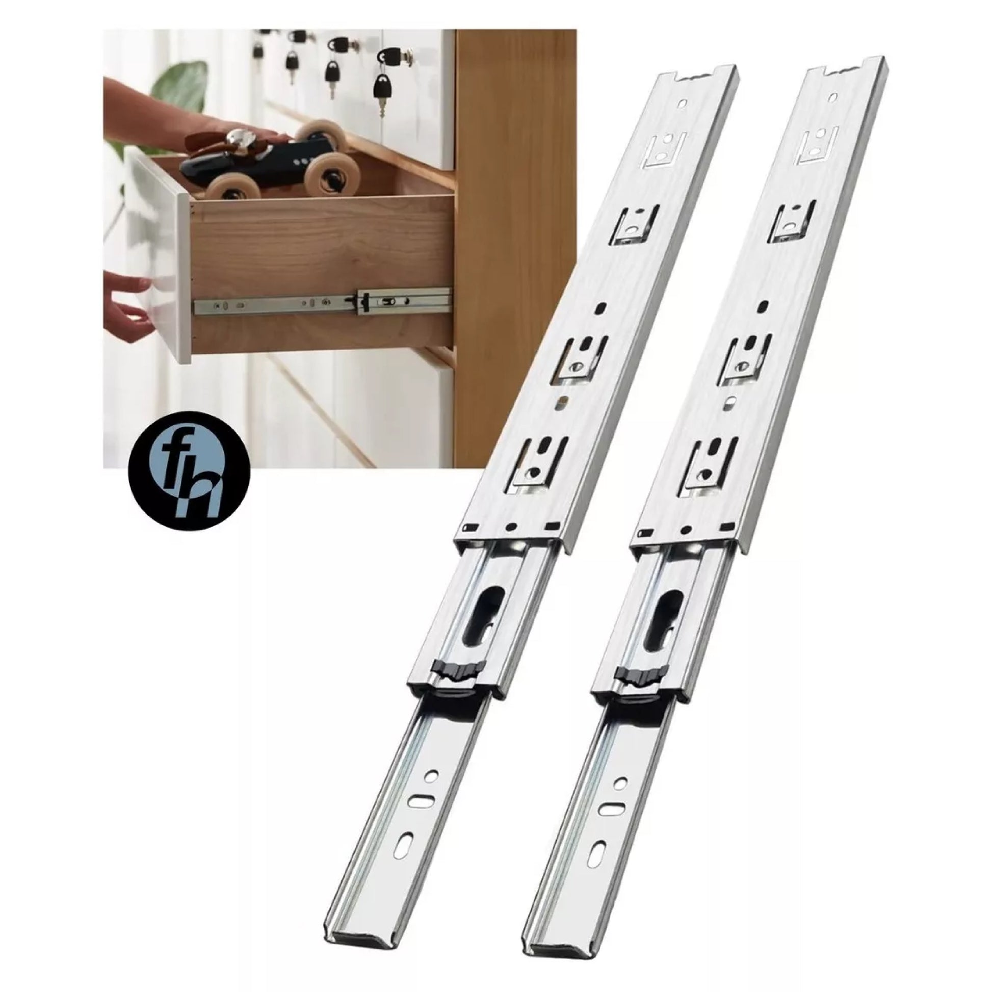 Corredera de Extensión Total Reforzada para cajón, fabricadas en lámina de acero con superficie lisa, que es robusta y duradera, con acabado en níquel satinado de alta calidad y sistema de balines para un deslizamiento silencioso y suave. Con mecanismo de abertura telescópica.