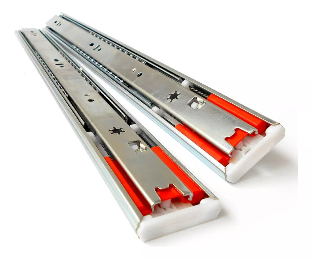 Corredera Telescópica de Extracción Total, con rodamientos de balín en línea y montaje en el lateral del cajón. Permite la apertura del cajón haciendo presión en la parte frontal, prescindiendo de jaladeras. Montaje o desmontaje fácil del cajón gracias a su sistema clip.
