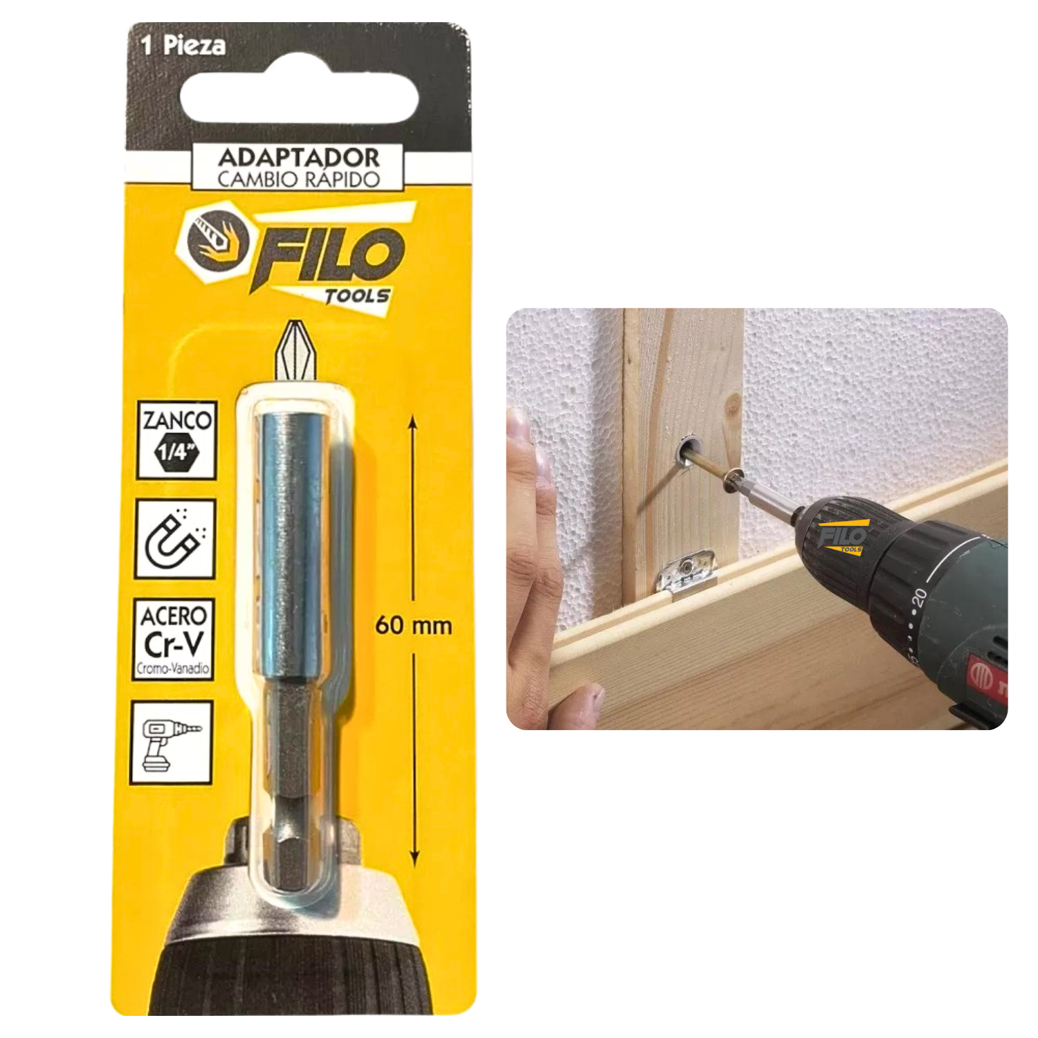 Extensión de brocas magnético hexagonal, está diseñada para cambios rápidos y seguros de brocas. Fabricada en acero CR-V, combina durabilidad con un sistema magnético que mantiene las brocas firmes durante el uso.