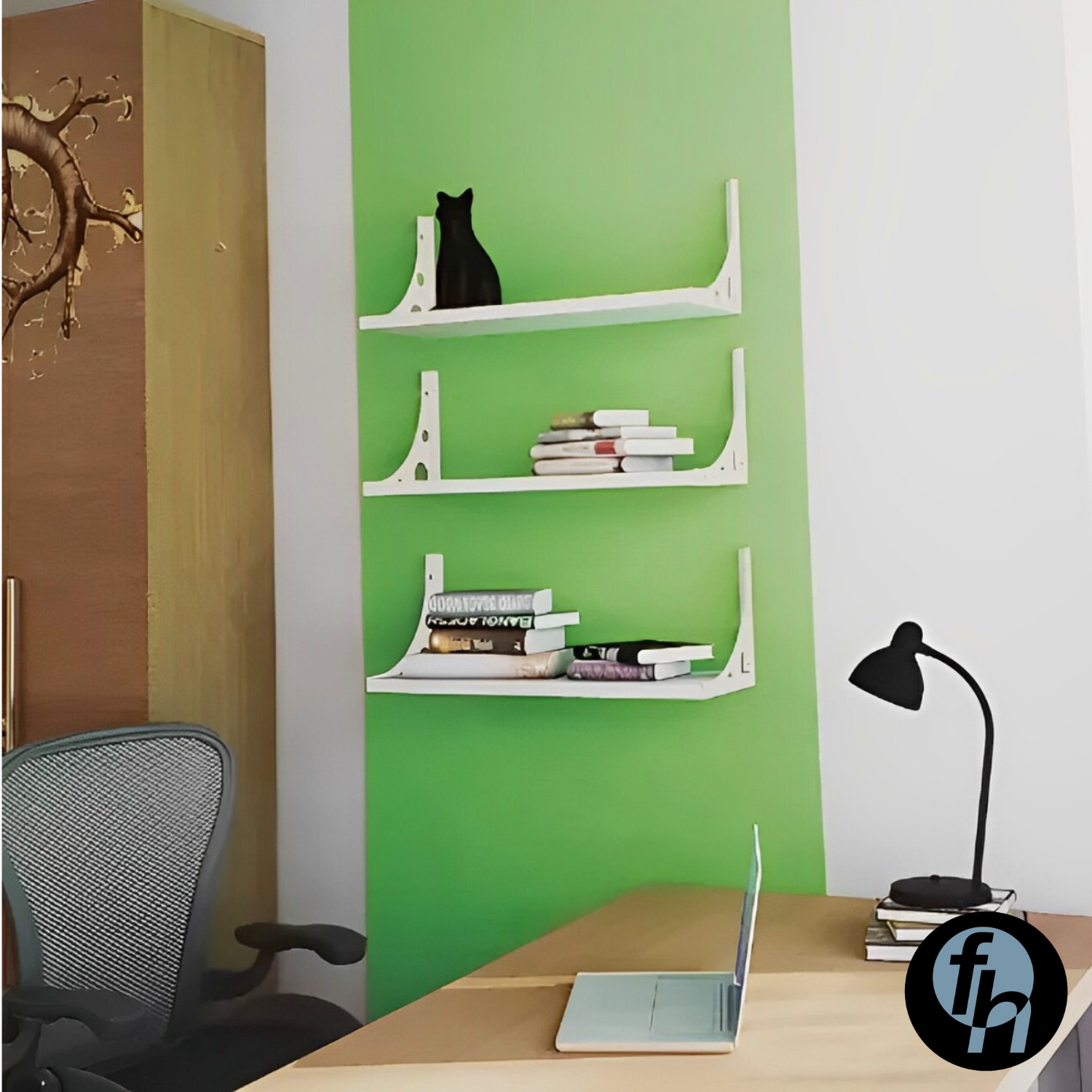 Soporte Mondrian Ducasse Decorativo para repisas. Fabricado en acero de 1.2 mm, recubierto en pintura epóxica y con terminación microtexturada que evita rayaduras, brindando mayor durabilidad. Su forma en ángulo recto permite que pueda ser usado en dos posiciones, sobre o bajo la repisa.