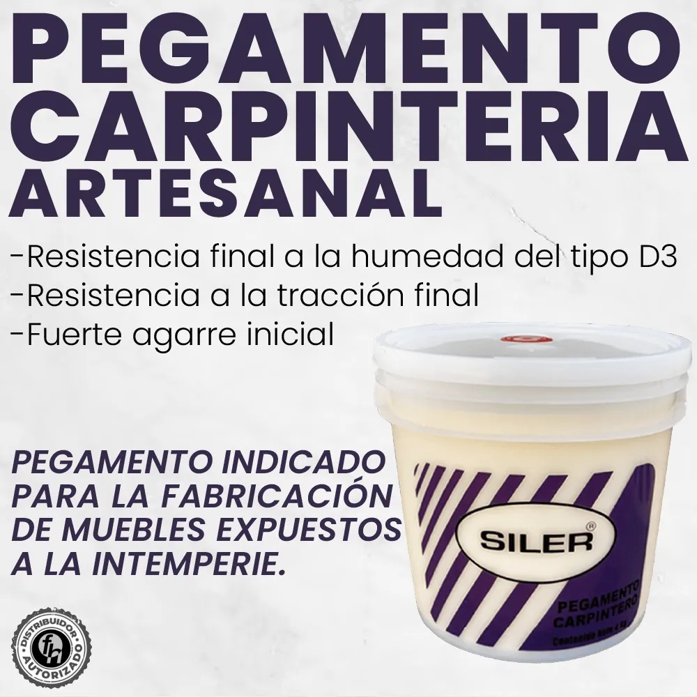 El Pegamento Carpintero Artesanal Etiqueta Morada Siler 4 kg es un pegamento a base de agua, de secado rápido, con fuerte agarre inicial y una excelente resistencia a la tracción final.