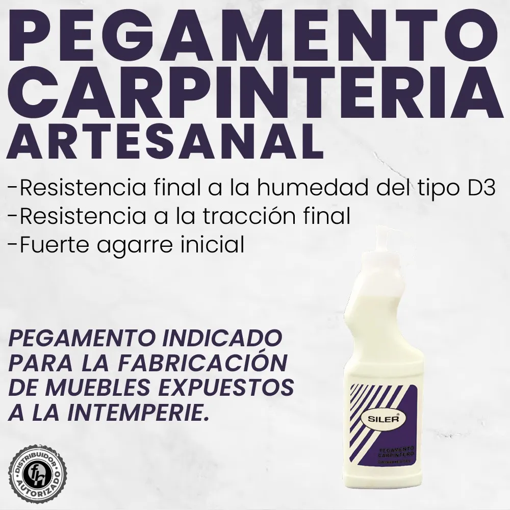 El Pegamento Carpintero Artesanal Etiqueta Morada Siler 750 g es un pegamento a base de agua, de secado rápido, con fuerte agarre inicial y una excelente resistencia a la tracción final.