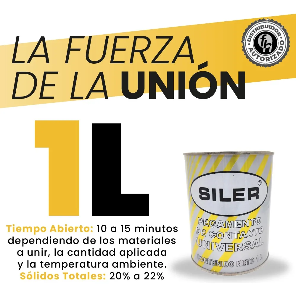 El Pegamento de Contacto Universal Etiqueta Plata Siller de 1 litro es ideal para la industria mueblera, un pegamento a base de solventes orgánicos, reducido en emisiones de VOC, de consistencia líquida espesa, de color crema, de secado rápido, con un excelente tiempo abierto, una alta resistencia a la tracción, impermeable y flexible.