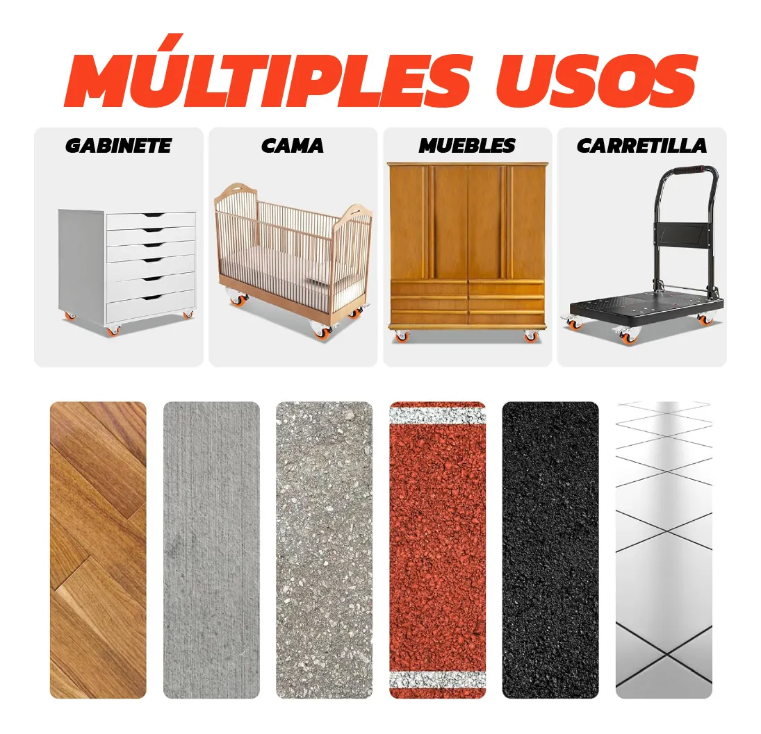 Es ideal para deslizar sobre pisos de madera, alfombras, cerámica o baldosas. Fabricada con poliuretano en aleación de alta resistencia, asegurando la suavidad y durabilidad del movimiento de las ruedas. Con el freno incluido es ideal para asegurar que los objetos no se muevan durante el almacenamiento, evitando daños a los usuarios y a los objetos mismos.