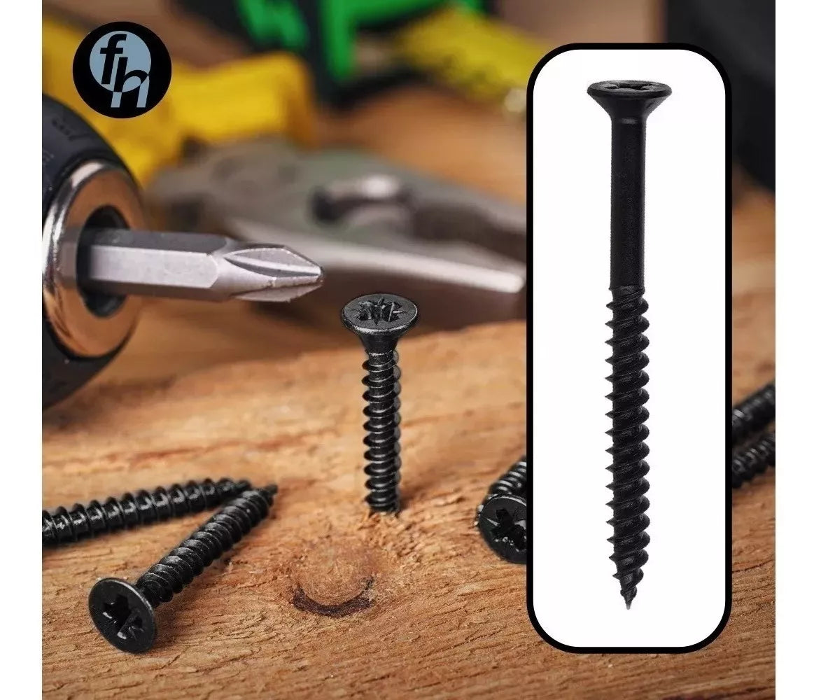 Tornillo Pija Aglomerado de Cabeza Plana Tipo Phillips con Nibs, cuenta con recubrimiento de fosfato negro que los hace más resistente a la corrosión, por lo que tienen una alta durabilidad. Perfectos para construcciones, placas de yeso, paredes de yeso, paneles de madera, escaleras y otras aplicaciones de interior y exterior. Gran variedad de medidas disponibles para todo tipo de trabajo de carpintería.