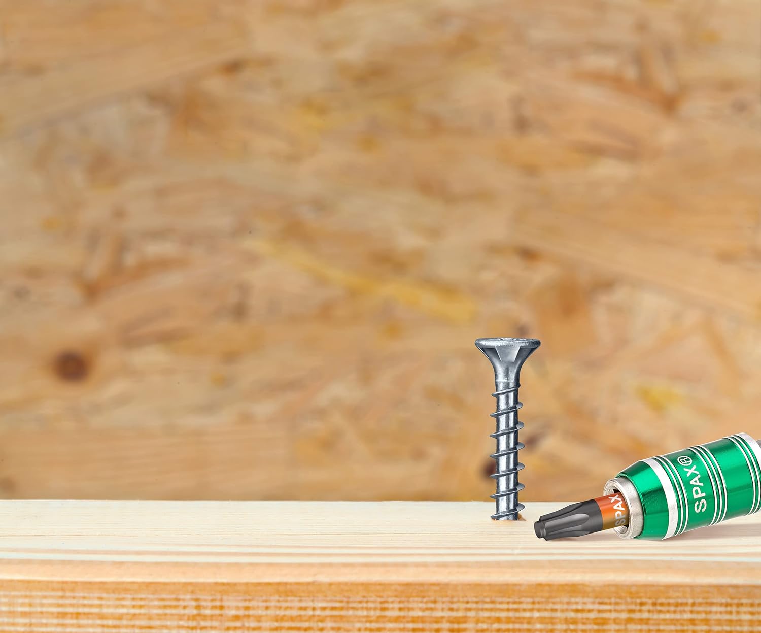 Tornillos Spax Universal para tus proyectos de carpintería. Equipados con una cabeza cónica T20, perfectamente compatible con el sistema T-Star Plus, estos tornillos te ofrecen una experiencia de trabajo sin igual. Fabricados con WIROX, garantizan durabilidad y calidad en cada pieza. Su diseño de rosca asegura un agarre firme en una amplia variedad de maderas, mientras que su punta cónica facilita la inserción, haciéndolos ideales para cualquier tipo de proyecto carpintería.